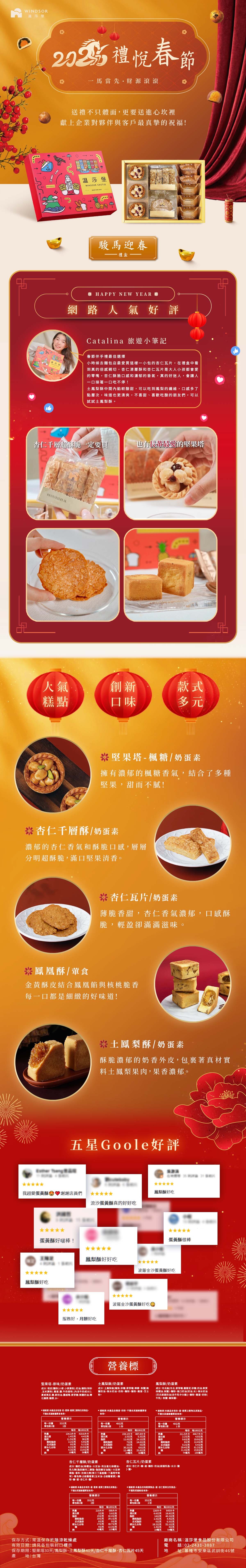 堅果塔香脆飽滿、杏仁千層與杏仁瓦片酥薄香濃;鳳梨酥與土鳳梨酥帶來層次酸甜,象徵好運旺來、甜蜜迎春,是馬年送禮體面之選🐎