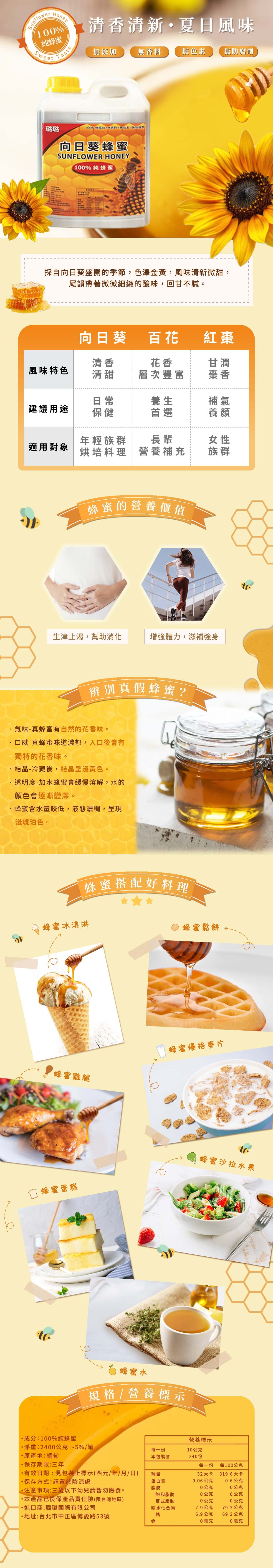 採自向日葵盛開的季節,色澤金黃,風味清新微甜,尾韻帶著微微細緻的酸味,回甘不膩。